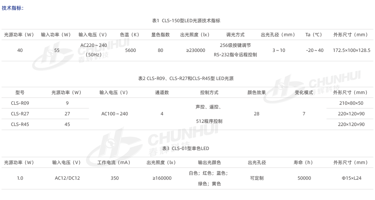 CLS-R09、CLS-R27和CLS-R45型 LED光源無(wú)噪音,輸出色豐富,混色均勻;