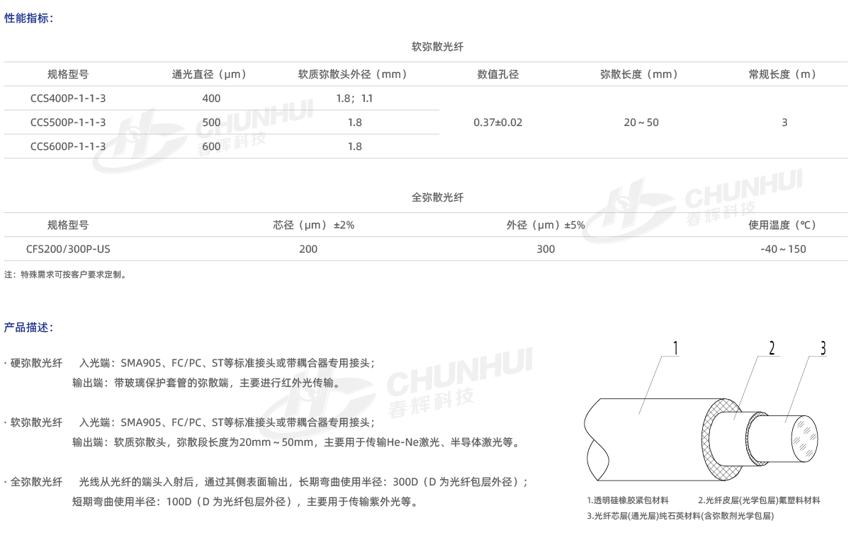 沿徑向均勻輸出光能量的光纖產(chǎn)品,主要分為:硬彌散光纖、軟彌散光纖、全彌散光纖;